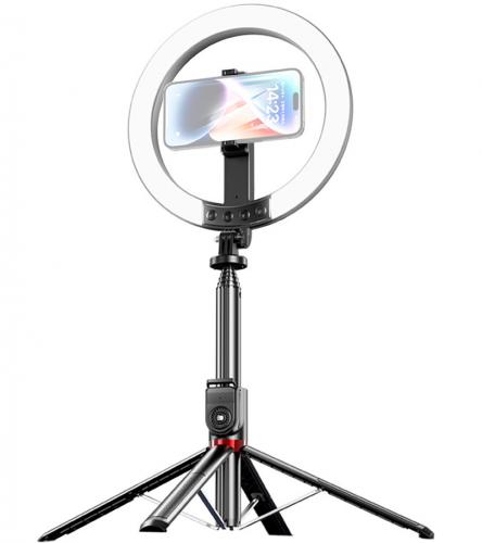 Φωτιστικό δαχτυλίδι LED ZB323 με τρίποδο & βάση smartphone, σε μαύρο χρώμα.