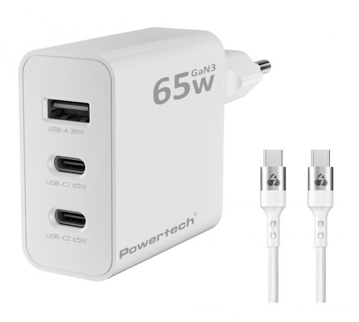 Υψηλής απόδοσης φορτιστής τοίχου της Powertech, κατασκευασμένος από ανθεκτικό υλικό και συμβατός με συσκευές που φορτίζουν μέσω θύρας USB. Διαθέτει 1x USB και 2x USB-C θύρες εξόδου που υποστηρίζουν φόρτιση με μέγιστη απόδοση 65W.