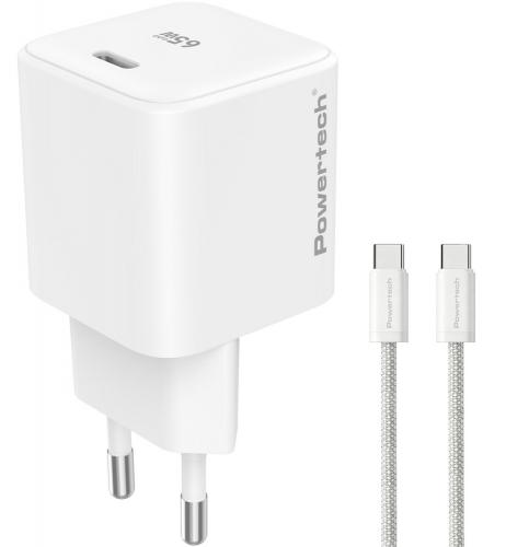 Φορτιστής τοίχου PT-1577 με καλώδιο, USB-C, 65W, GaN, AVS σε λευκό χρώμα.