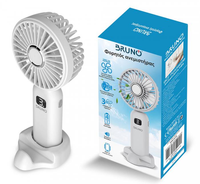 Φορητός ανεμιστήρας χειρός επαναφορτιζόμενος BRN-0236, με βάση, σε λευκό-γκρι χρώμα.