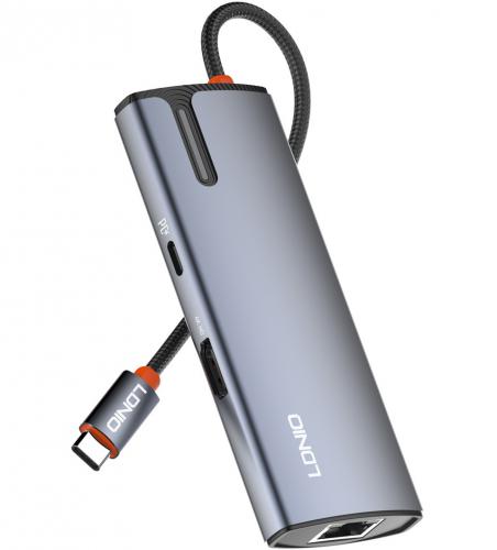 Docking station US-SJ643, 8 θυρών, USB-C, 4K, 100W PD, LAN σε γκρι χρώμα.